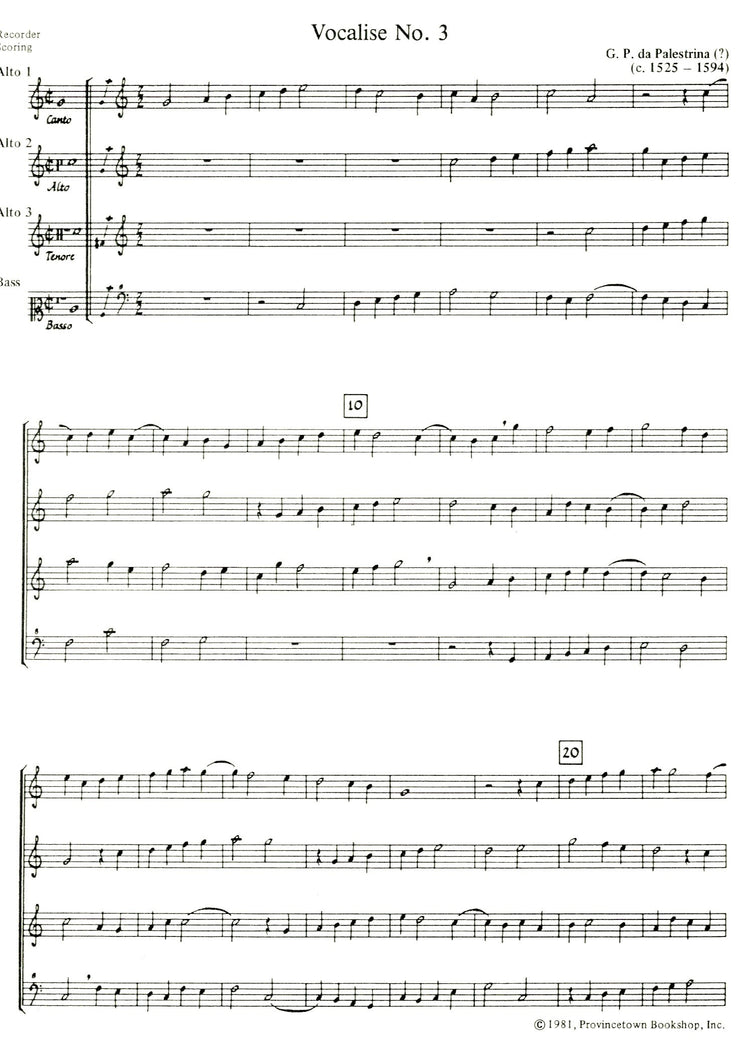 *Five Vocalises* 4 part harmony exercises, constructed on the hexachord. There is a great deal of variety in his use of techniques such as augmentation, diminution, contrasting countersubjects etc. Arranged from simple and easy even-flowing pieces to florid and rhythmically more complex examples.