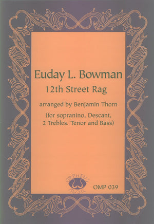 Euday Bopman, composer of Twelfth Street Rag, does not feature prominently in histories of early jazz. The Gospel, Blues and Jazz volume from New Grove mentions him only as one of a number of Eastern U.S. composers writing a flashier style of rags than those of Joplin and his Midwestern contemporaries. Gunther Schuller does not mention him at all in his history of early jazz. Twelfth Street Rag is probably Bowman's best-known composition and seems to be typical of the three-strain rag common to this school of composers. While the instrumentation of this arrangement is the same as that of the Joplin rag above, the results are far less satisfactory. The melodic burden is again on the sopranino, usually in a trio with the soprano and first alto. This works fine through the first two strains. In the third section, however, a near-ostinato on C-C#-D above the staff presents some serious technical and intonation problems. That and two other problems make this piece more suited to advanced ensembles. The first is extended range: basses are frequently called on to play up to high E and altos have many high Gs. The second problem is that the tenor is regularly required to play low C#/Db. Unless the tenor recorder has this key, it would be advisable to have the tenor part doubled by bass to cover these very frequent chromatic passages at the bottom of the tenor range.