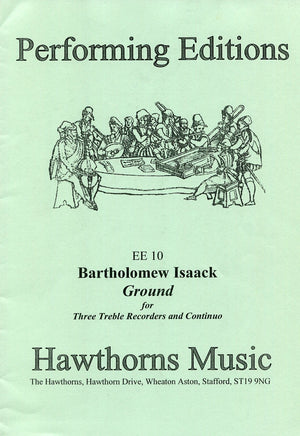 The charming and ingenious Ground: - Mr Batholomew Isaak for 3 trebles and bass (Drexel 5061)was probably composed about 1677 and is contemporaneous with the similar and much better known 3 parts on a ground by Purcell, a likely co-chorister with Isaak at the chapel Royal during the 1670's. Though not of the quality of Purcell's masterpiece, it nevertheless bears comparison in its use of canonic devices and general layout - either or both compositions could have been devised in a spirit of friendly emulation at the time.