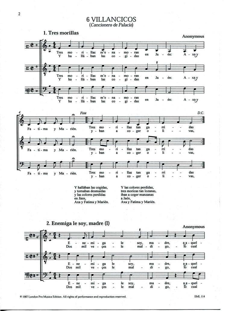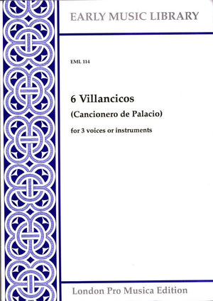 *Six Villancicos.* These songs, written between 1505 and 1520 are from a collection in the library of the Palacio Real in Madrid. the greatest collection of Spanish secular music, with many songs that have become classics. These little pieces are very varied, with a couple of outrageously sardonic numbers. Several pieces in the source, including Pensad ora en al are, in the unusual quintuple metre. For 3 voices or instruments.