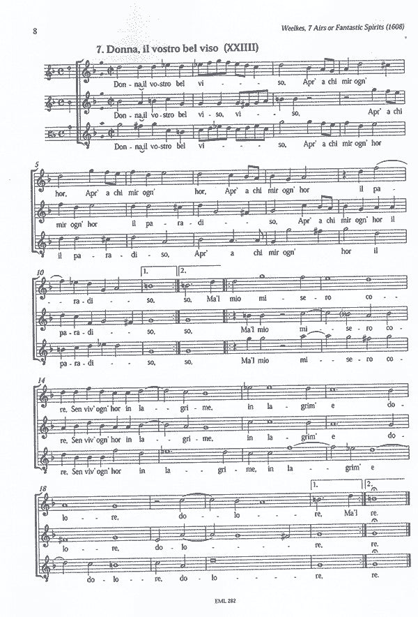 *Seven Renaissance Airs.* Published in London in 1608, Weelkes Airs of Fantastic Spirits contain 25 light-hearted three-part pieces. Based on the Italian villanella and canzonetta, Weelkes is more varied in style with some references to popular dance music.