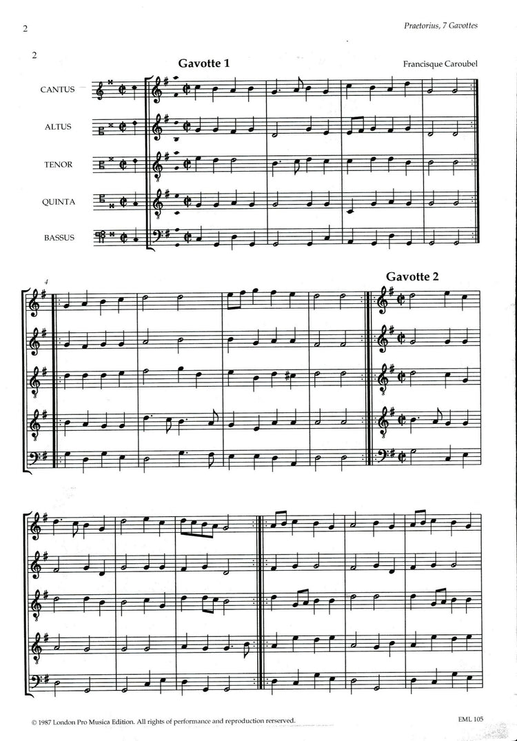 This suite of Gavottes (surely the earliest use of this dance term) comes from Praetorius~~~~~ massive Terpsichore, a collection of (mostly) French dance tunes in polished settings. A couple of these gavottes are very familiar today, mostly from recordings.