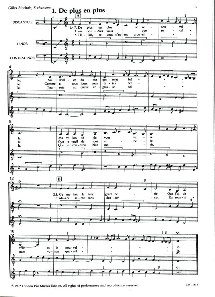 *Medieval Songs.* Binchois is considered to have had a genuine gift for melody and an acute sense of how to shape a phrase, as can be seen in his lovely Triste Plaisir. While most of his pieces are rondeaux, including seven of the eight pieces here, Filles a marier unusually combines two popular songs, treating one as an imitation. For three voices or instruments.