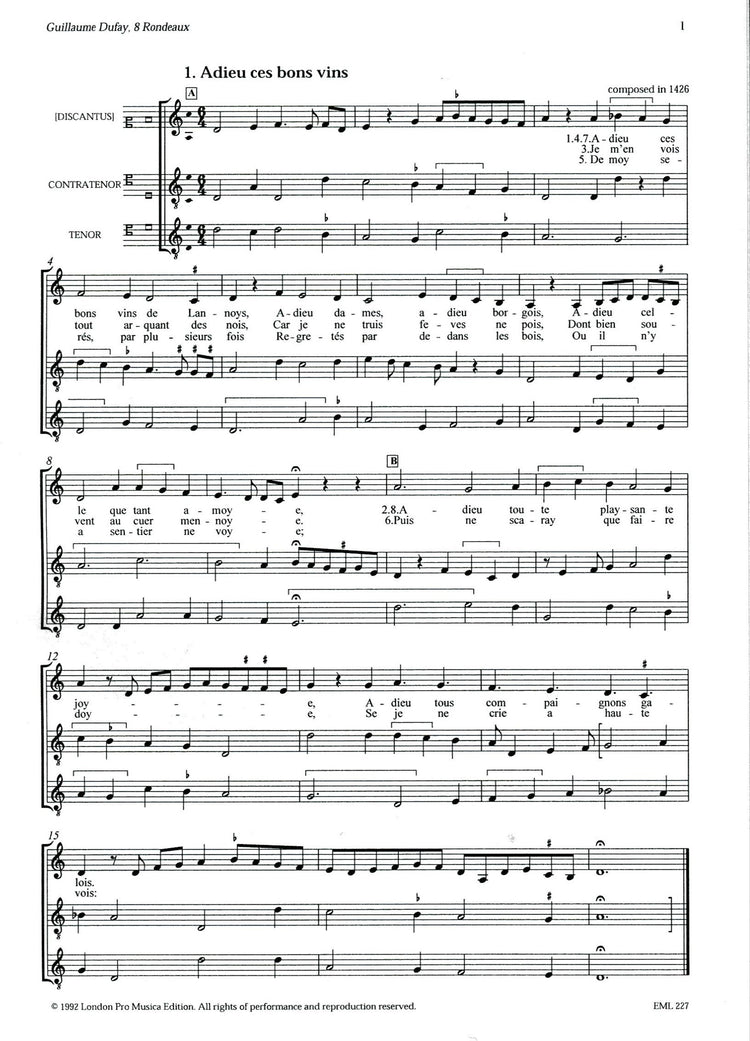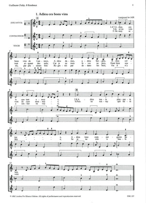 *Eight Medieval Pieces.* Dufay~~~~~s secular pieces show striking originality at times: in Donnes l~~~~~assault, for example, he deliberately alternates Eb~~~~~s and E naturals and employs triadic figures at the end. For three voices or instruments.