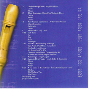 Benjamin Thorn takes a significant role in the production of this CD through his contribution to three works. His own composition, Deep Sea Perspectives, begins the CD. The composer has that habit of throwing something quirky and humerous at you just as things begin to sound familiar. You think you are in the 16th century when suddenly you realise you have jumped a few hundred years forward in time. However, an even stronger reference to the Renaissance is made through the second work on the CD in which Thorn takes three Recercadas of Diego Ortiz and adapts them for the recorder ensemble. The more standard modal polyphonic writing one would expect to hear from an ensemble of recorders is evident in these works. Repetitive harmonic progressions of a Renaissance dance show through, as do complex polyphonic interlocking parts.