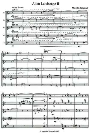 Written and originally published (by Cootamundra Music) in 1982, Alien Landscape II resembles its counterpart Alien Landscape I (1979, an electronic piece for analogue synthesiser). Using many of the varied and diverse techniques open to the modern recorder player (covering and uncovering the labium, flutter-tonguing, tremolos) as well as effective utilisation of dynamic contrast and staccato notes, the recorder consort is made to sound remarkably akin to an electronic instrument. The Preface explains how the music should evoke the feeling of an unknown countryside at night, where mysterious natural sounds can be heard and the static nature of the piece successfully conjures up this idea.