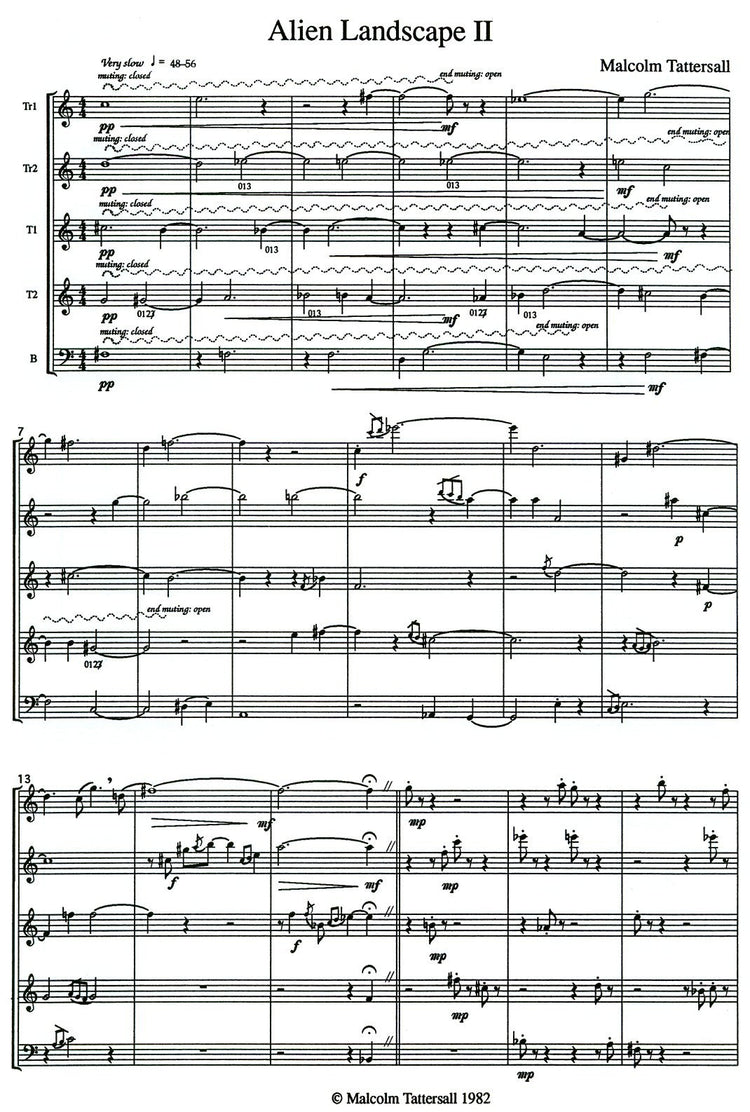 There is a notable section where the timbre of tenor and bass tremolos on their lowest notes is truly haunting, and another where a loose motif is passed briefly around before the last homophonic section. The last five bars use muting and are retrograde of the beginning of the piece in pitch values (although not in time values), perhaps a final message of the uncertainty of this "Alien Landscape".