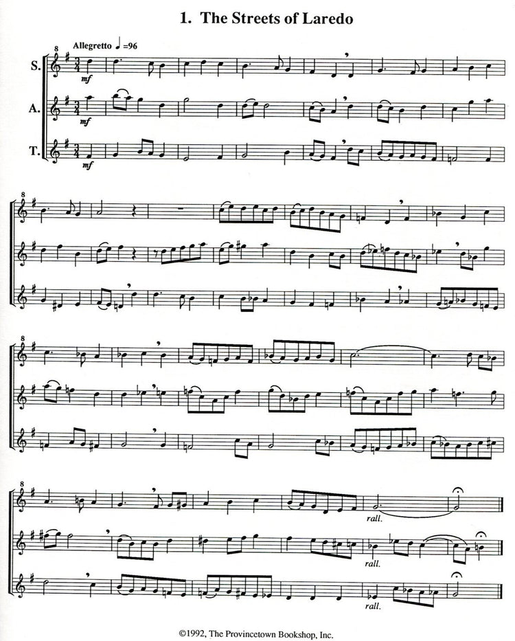 *Nine Folksongs*. Interesting and sophisticated arrangements of well known songs. The melody flows through all three voices.