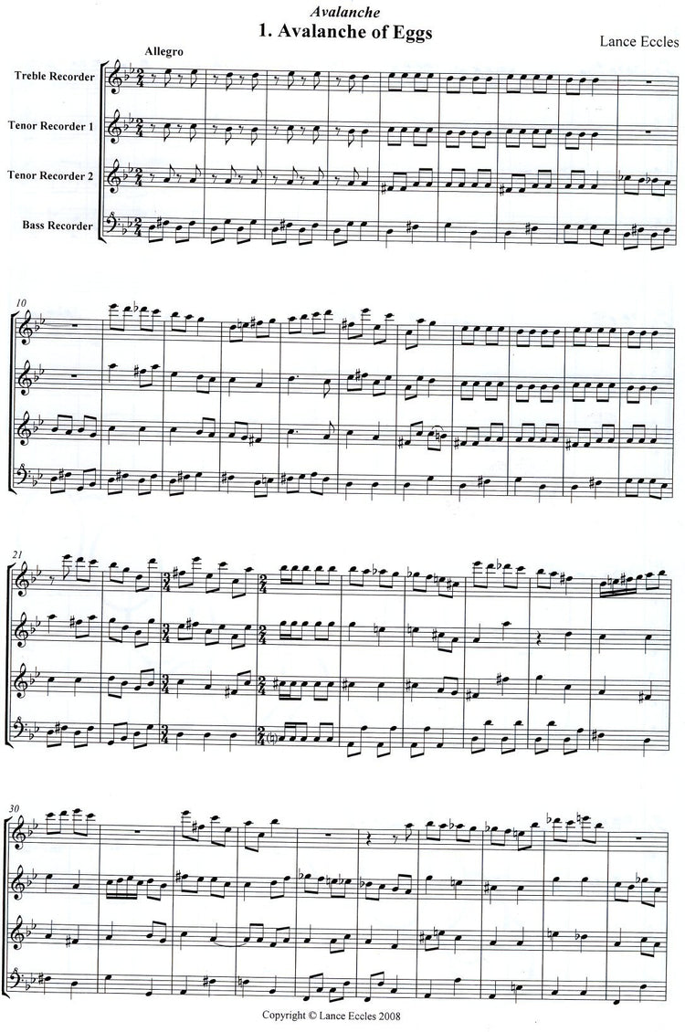"Avalanche of Eggs," first in the suite, is a bitingly dissonant allegro, fun to play and hear. The alto player must perform some challenging skips, but the other parts are fairly easy. After all the dissonance (perhaps a dozen or so eggs hit the floor?), the piece ends on an oldfashioned, optimistic Major chord.