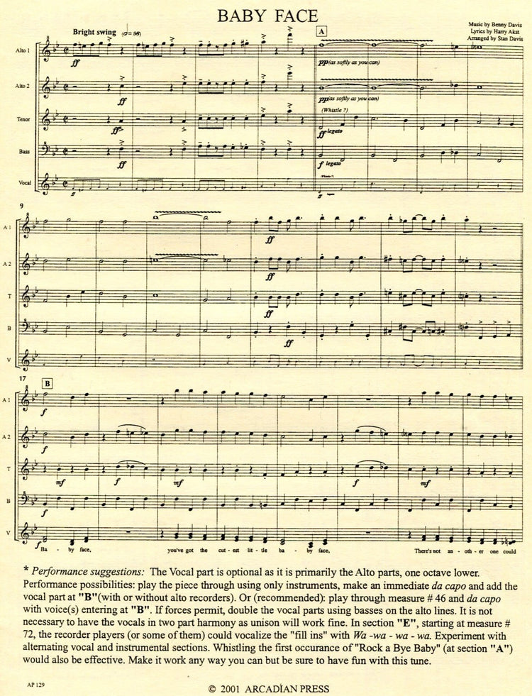 *Jazz song arrangement* for recorder quartet with optional vocal duet. Includes performance suggestions and song lyrics.