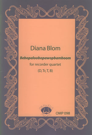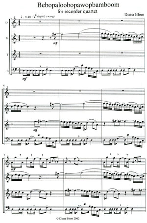 Australian composer Diana Blom's Bebopaloobopawopbamboom is a catchy number that general audiences will surely like, and is typical of a certain kind of recorder work that is not real jazz, but "jazz-influenced". Its simple ABA form is based on compositional ideas rather than on a chord progression. The A sections feature a funky ostinato bass line with attractive riff figures simultaneously overlaid upon it. The B section is homophonic, but also features measure-long improvised solo breaks for each instrument. For these, Blom supplies both gamut and ordering of pitches so that the only thing the player has to make up is rhythm.