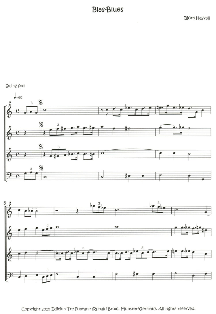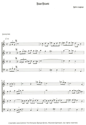 *Jazz Inspired Contemporary Recorder Quartet.* This work is intricate - there is lots of syncopation but the speed indicated by the composer is not fast. Definitely the blues! This would be a great work for an intermediate ensemble to perform. With a catchy melody, this piece is bound to be a crowd pleaser. Includes notes in German.