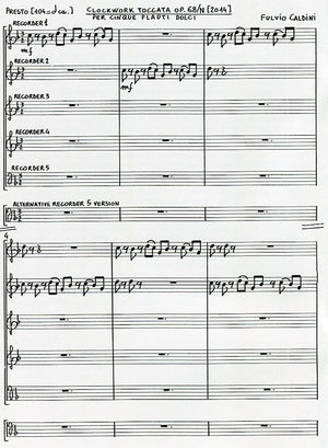 *Contemporary Recorder Quintet.* Features much chromaticism and changing metre. This pendulum starts off with a simple quaver motif and builds in a canonic style to a finale with clockwork precision. Includes biographical information about the composer. Presented in neat composer autograph style.