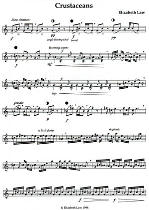 Elizabeth Law's Crustaceans came as a very pleasant surprise. Another Mendelssohn? Perhaps not, but at least music which has wit and flair. This is for unaccompanied treble, has no time signature and presents some technical challenges; as well as being able to tackle some quite tricky note patterns, the player of 'Crustaceans' has to stamp a foot, produce some largely unnotated twittering and make random finger sounds. The use of a novel scale pattern of irregular intervals starting from a low G (though it never appears as a scale as such) gives the music a distinct flavour. Beginning with just a couple of notes, the composer builds a sequence of fragments, gradually introducing more notes and getting higher in pitch as the speed increases - rising to a top C. The title refers to crabs scurrying across a beach but the music has its own logic. I can imagine audiences really enjoying this little piece and, once they've got round the notes, recorder players too.