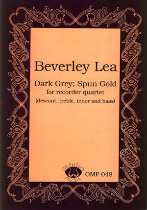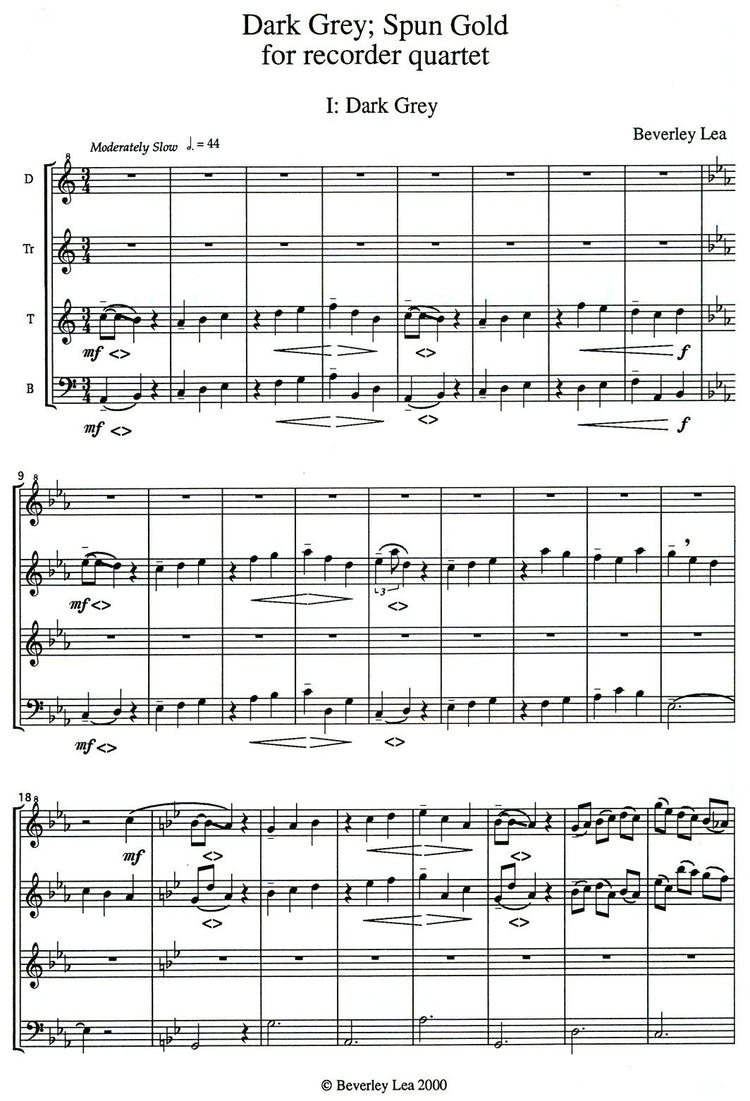 Dark Grey, Spun Gold by Beverley Lea is a two-minute long, two-movement work for quartet. The names of the two movements are those of the two halves of the title. "Dark Grey" is rather slow whereas "Spun Gold" is quite fast. The only difficult techniques are the numerous short glissandi that occur throughout both movements; however, the composer provides special fingering suggestions to help players execute them. Other than that, the content is quite straightforward. Copious articulation, phrasing, and dynamic markings are given. To this reviewer, the work seems a bit "slight"; the material has more potential for development and further exploration than what is given. However, it would be effective in a setting where a very short contemporary work with contrasts is needed. The score and parts are clear and readable.