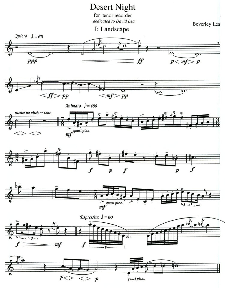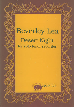 Beverley Lea is an Australian composer who has published a number of works for recorder by Orpheus Music. Desert Night for solo tenor recorder has five short sections titled "Landscape", "Cry", "A Lizard Looks", "Moon Dance" and " The Stillness". The work uses as number of extended techniques, but it is worth learning by those players who have not tackled works of this genre, as the written music is not too advanced.