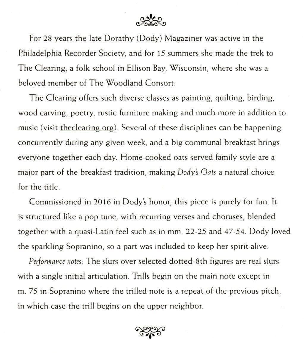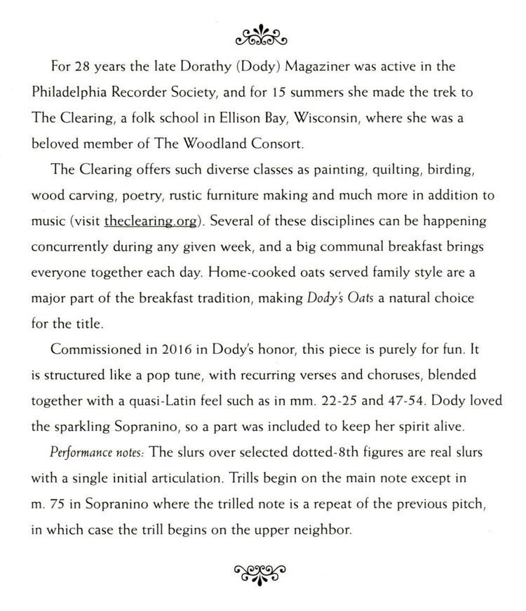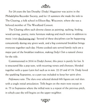 This work was commissioned for the late Dorathy Magaziner who was active in the Philadelphia Recorder Society and was also a beloved member of The Woodland Consort at The Clearing. This work is challenging and rewarding to play and would suit an ensemble of competent players who have been studying the recorder for about four years onwards. It is an exciting and interesting piece.