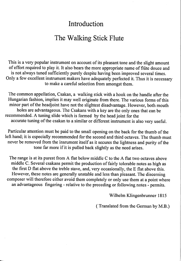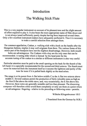 The common appellation, Csakan, a walking stick with a hook on the handle after the Hungarian fashion, implies it may well originate from there. The various forms of this minor part of the headjoint have not hte slightest disadvantage. However, both mouth holes are advantageous. The Csakans with a key are the only ones that can be recommended. A tuning slide which is formed by the head joint for the accurate tuning of the csakan to a simliar or different instrument is also very useful.