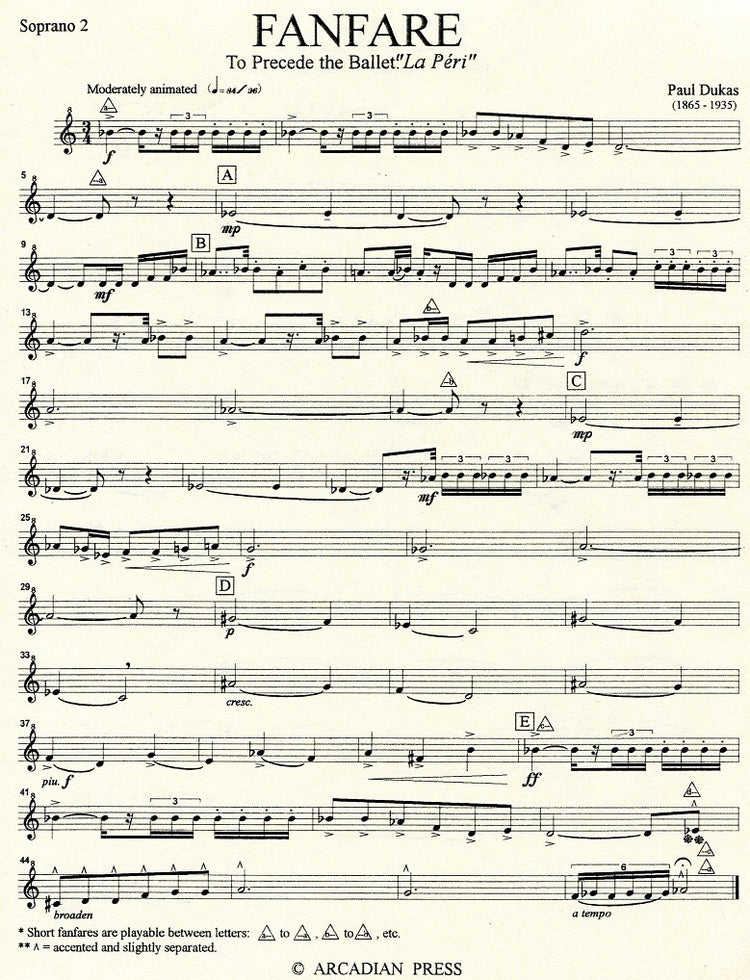 *Romantic Fanfare* from the Ballet, "La Peri". This is a very interesting piece to play and also to listen to. There are quite a lot of fast tongued passages with some chromaticism.