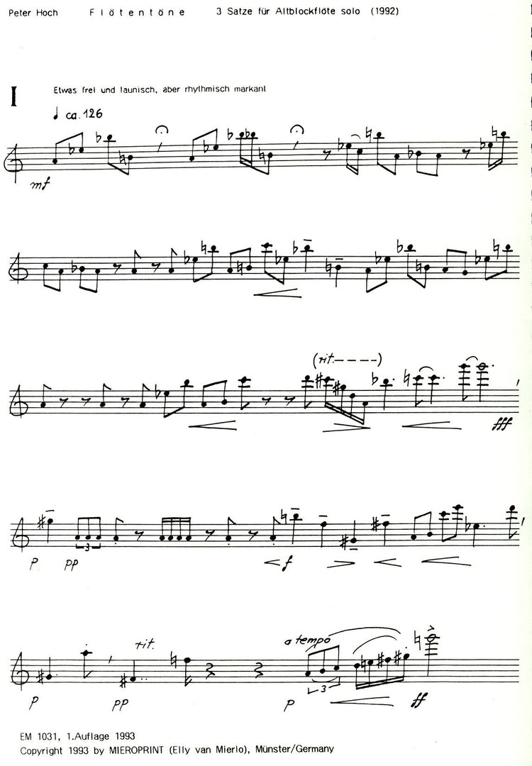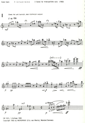*Single contemporary piece* with 3 sections. The last section is based on improvisation while the first two are more structured but also quite free. It uses avant garde techniques with fingering and performance guides, as well as notes on the composer, in German.