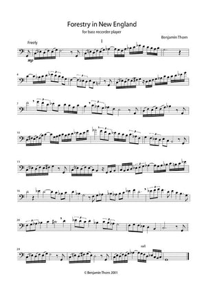 Forestry in New England is also a parody. This is at least evident in the free recitativo-like opening movement. The second movement, in a fast 7/8 meter has a dynamism reminiscent of Thorn's earlier work. It is most humorous in its raucous use of multi-phonics as a distorting device. In the third movement, Thorn employs silly, old-fashioned melodic clichés from the ragtime era which he makes even more comical by having the player sing them into the recorder whenever they appear.