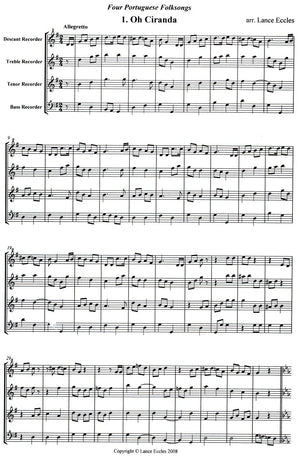 *Four Portuguese Folksongs* for Recorder Quartet, in attractive and fun arrangements. Some nice metrical elements.