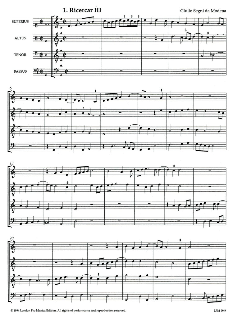 From the collection of Italian Instrumental Music of the Renaissance, these are Renaissance pieces in four part settings. Parts are Canto, Alto, Tenor and Basso. Alto and Tenor parts are supplied in both treble and tenor clefs. Extensive introductory, performance and editorial notes included.