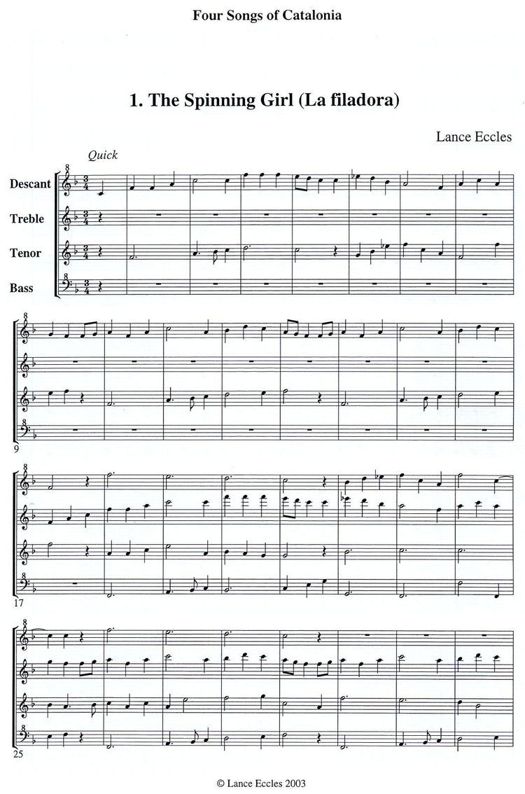 The Catalonian songs comprise a spinning girl (who doesn't seem to have her mind on the job, as she spins a very fragmentary thread), some reapers (who appear a little drunk as they keep missing a beat), a thief (whose rather operatic tune seems a little inappropriate for one who follows such a stealthy profession) and a very fast Lady of Aragon (who manages to keep going for a cool 120 bars in spite of suffering the same incapacity as the reapers).
