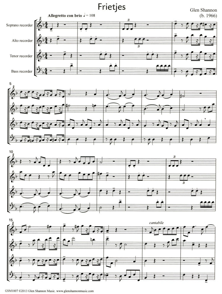 *Contemporary Recorder Quartet.* Glen Shannon has had great success with his compositions and is now publishing music. The pieces are all beautifully presented and interesting repertoire and are exceptionally good value both from the perspective of price and quality of the works. This work includes detailed notes about the piece.