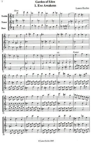 This work comprises three titled movements. The first movement, "Eve Awakens", one might assume to mean her awakening to good and evil, as there is a lot of harmonic and rhythmic tension between the voices. The faster main section is dominated by a 3+3+2 rhythmic pattern.