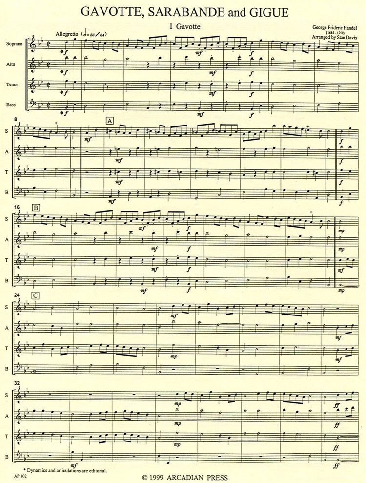 *Three Baroque Suite Movements* arranged for recorder quartet.