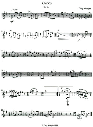 Gecko is a one-page composition for solo soprano recorder that can be performed in less than a minute. The rhythm is complex, using constantly shifting time signatures, syncopation, and some additive rhythms. It has a key signature of one sharp, starting on a B, ending on a D, and in between using every note in the chromatic scale. Technically speaking, this could be learned by an upper intermediate player. The range is from low D to high C, one whole step short of a two-octave range. There is one measure of flutter tonguing and one easy-to-play double stop. The tempo marking is crotchet = 128, but players who are less secure with complex rhythms might need to set their metronomes to the eighth note.