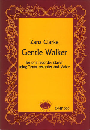 Gentle Walker is a duet for a recorder player who sings into the instrument while playing, is the most attractive of Clarke's pieces, not so much because her ideas are more interesting, but because it is in three movements, and therefore her premises are less extended. The first movement is moderate and melodically wandering. Her simple polyphonic writing would be easy as a recorder duet, but to sing one part and play the other at the same time is very hard. The second movement is easier, since the voice part is in unison with the recorder except for the last few bars. Clarke gives us her most homogeneous statement in the extremely difficult third movement. Here an ostinato figure that changes slightly in each melodic section accompanies an increasingly faster moving melody, something like van Eyck's variations but without a theme.