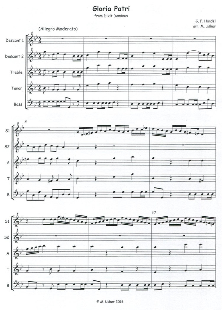 *Gloria from Dixit Dominus* arranged for recorder quintet. This work includes quite a lot of extended semiquaver passages and is in the key of g minor. There are some technical challenges but a great reward when the performance comes together.