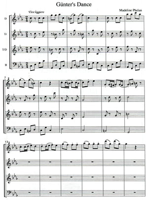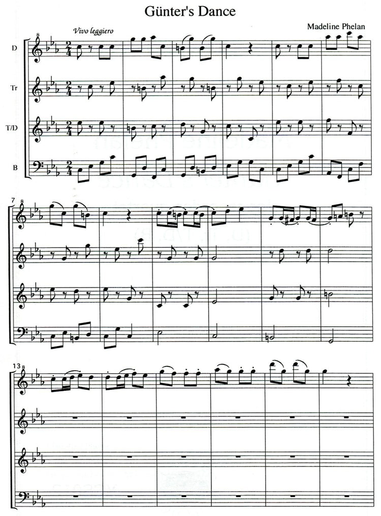 This piece is published as part of the Young Composer's Series form Orpheus Music Publications. According to the notes accompanying the publication Madeleine Phelan wrote Günter's Dance 'after being inspired by a friend's rendition of "Günter had a little lamb" (complete with German dance)'. I have to admit that I am not familiar with that particular German song, but Phelan's piece itself is a concise, fun and sprightly piece for recorder quartet (SATB).