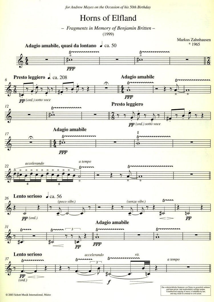 *Contemporary Piece.* Employs avant-garde techniques including harmonics and alternative fingerings. Includes preface, performance notes and composer biography.