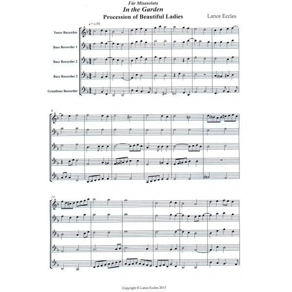 With a recommended tempo of Crotchet-90, the Procession of the Beautiful Ladies moves like a slow grand march, with the tenor playing the melody four times with small variations. The four other recorders provide a changing underlying texture of sound and movement.
