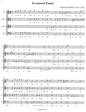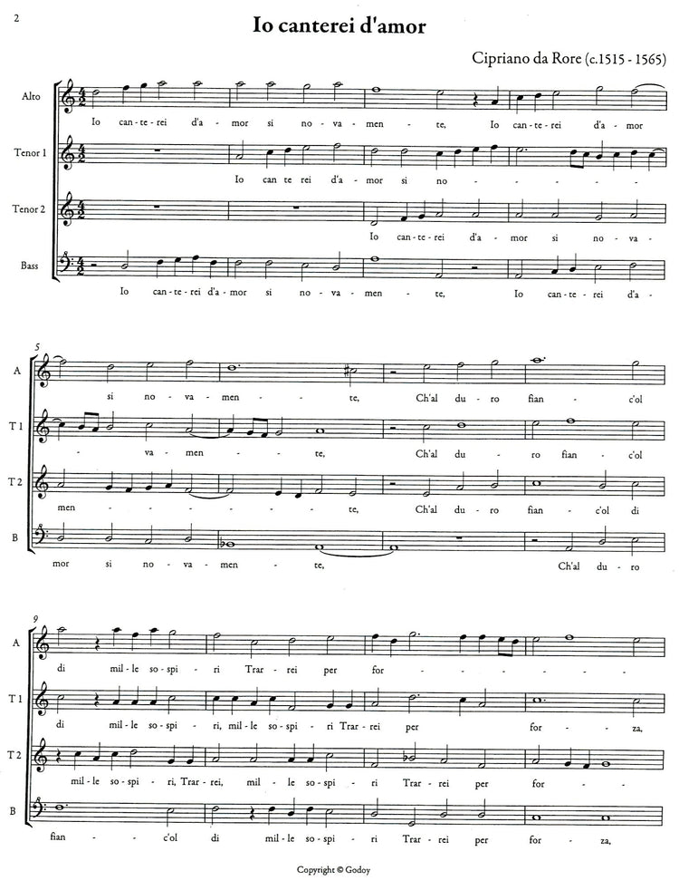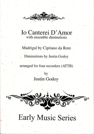 *Madrigal by Cipriano da Rore with Diminutions by Justin Godoy* for four recters. Includes the original 14th Century Sonnet by Francesco Petrarca in both French and English.