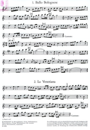 *21 Dance Tunes.* Instrumental Balli including Ballets, Corrents, Sarabandes and Allemandes.