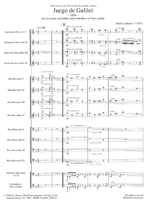 *Single Contemporary Movement* feature dissonance, chromaticism and glissandos. Includes notes on the recorder orchestra and a foreword. Copying of parts from the original is allowed for larger ensembles.