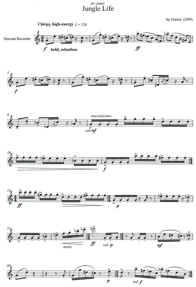 *Jungle Life* is a tone poem giving the player and listener the experience of a jungle expedition encountering all manner of things tropical. During this piece; oppressive heat, squawking parrots, sultry nights, urgency of survival and som cooler and calmer reflections. This work was composed in December 2009 for James Brookmyre.