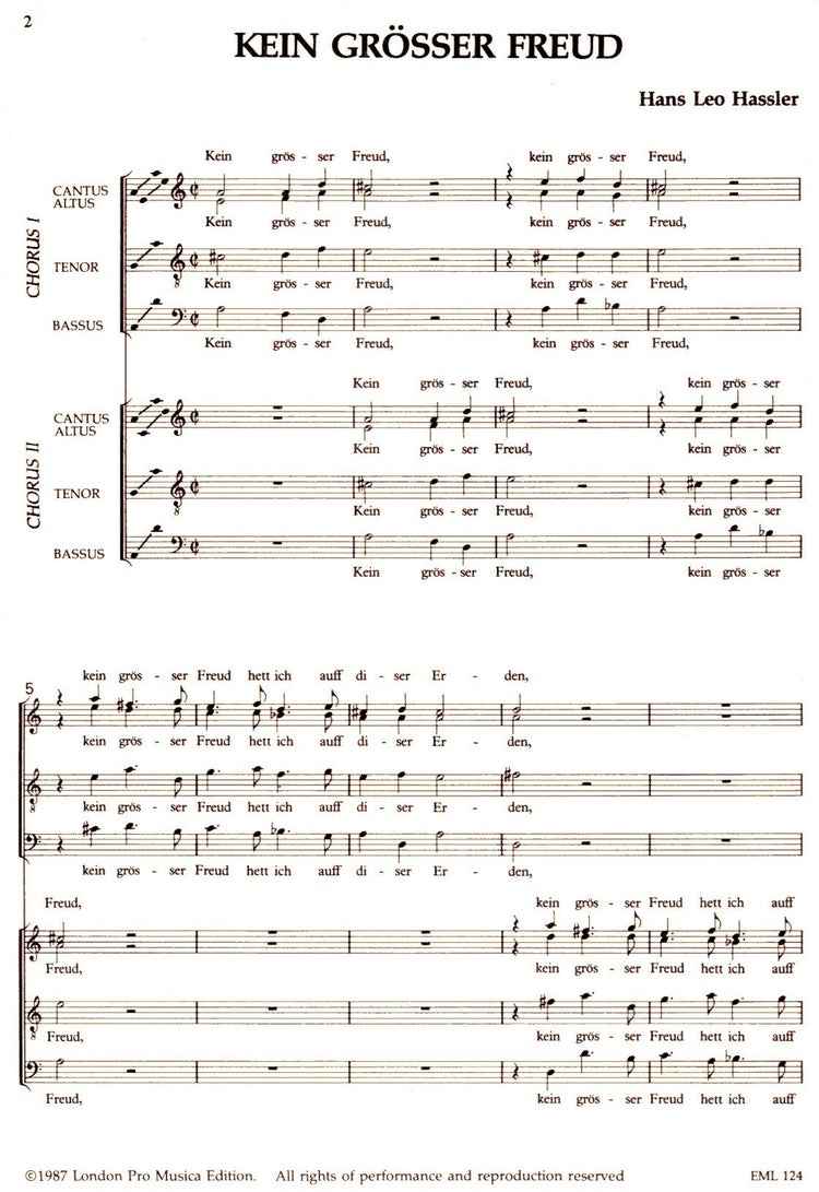 *Renaissance Motet.* A lively piece in a Venetian style, actually rather similar to Gabrieli's Lieto godea (EML 118). Hans Leo Hassler was a gifted composer who was sent off to Venice at an early age to study with Giovanni Gabrieli. Includes epilogue, lyrics and translation.