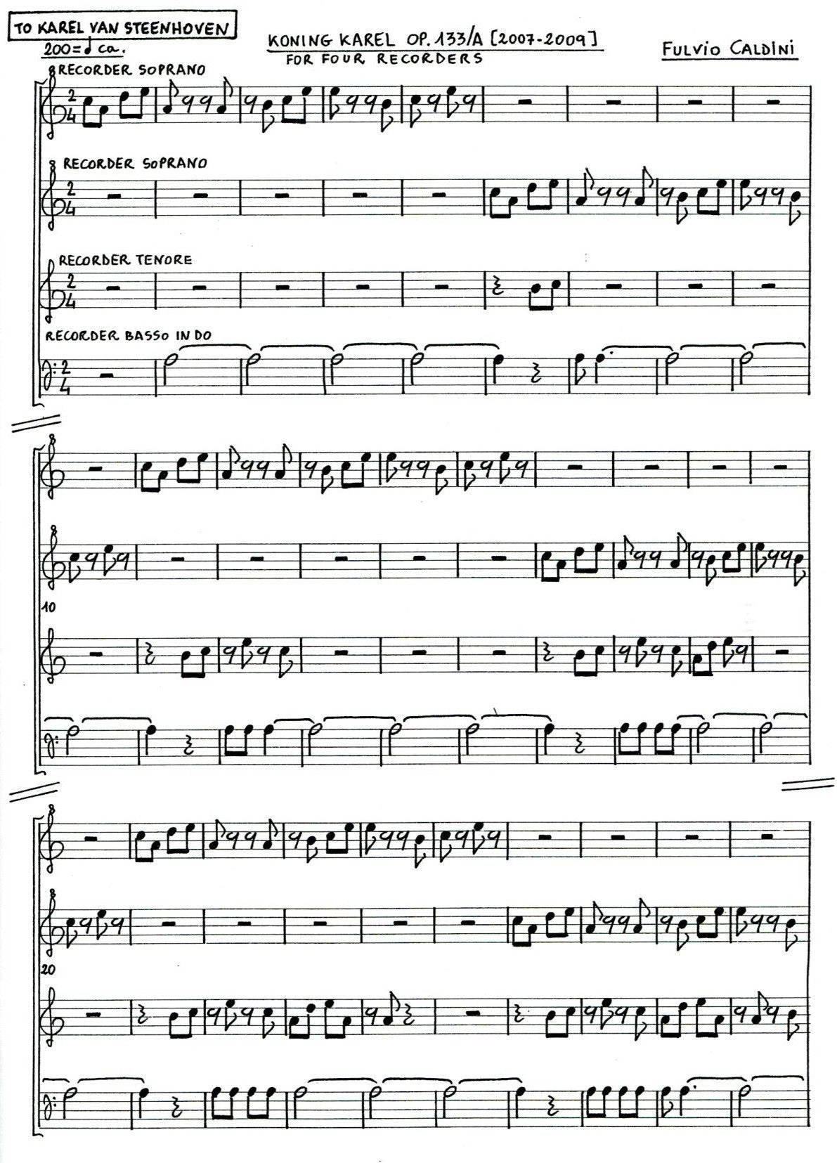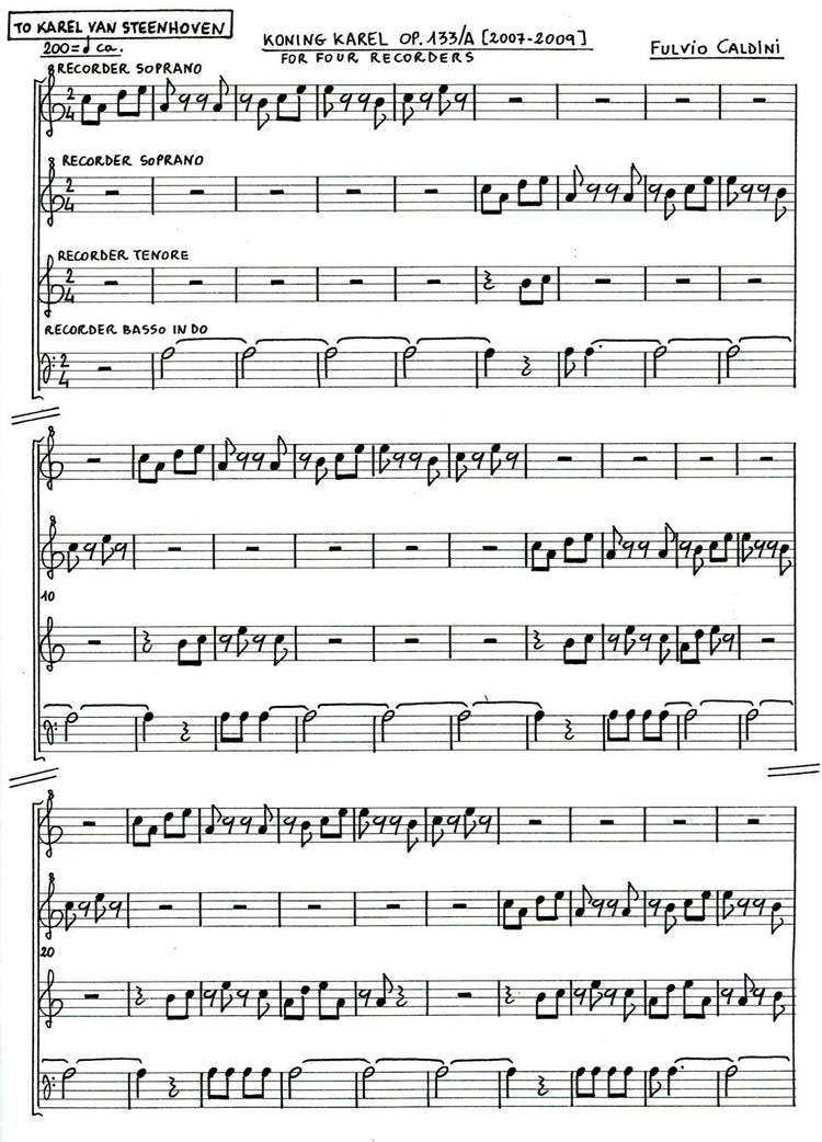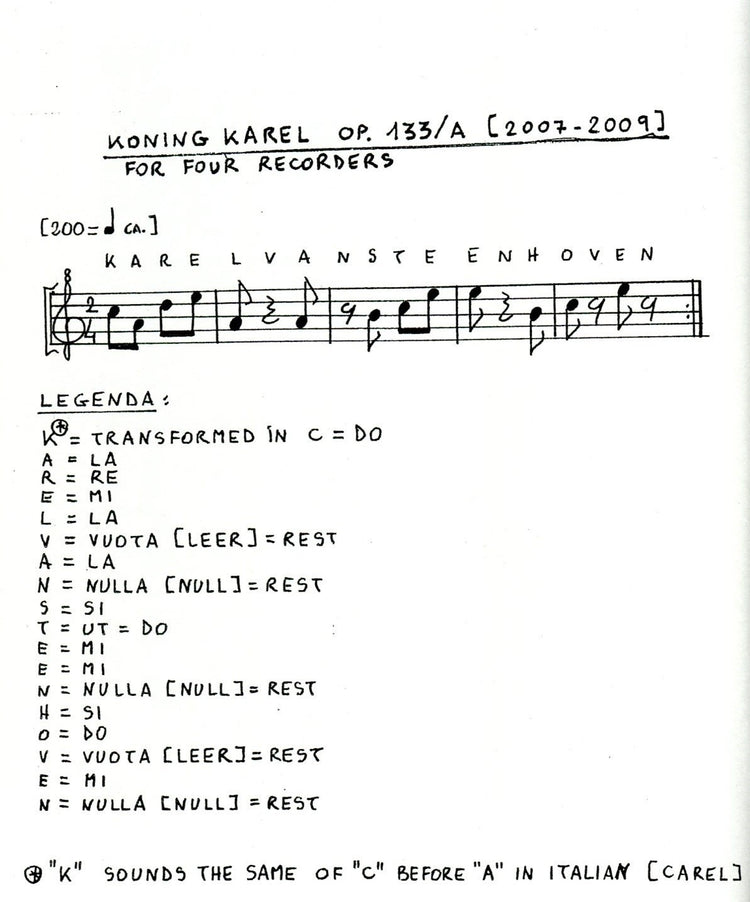 *Contemporary Quartet* dedicated to Karel van Steenhoven, a Dutch composer. Not unlike a serial composition, the letters KARELVANSTEENHOVEN are each allocated a note or rest. This row is then used in interesting formations to create a quartet. Neatly handwritten score and parts. Features some syncopation and changing metre.