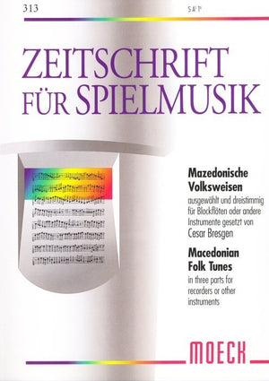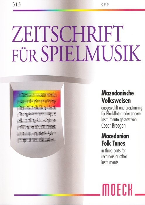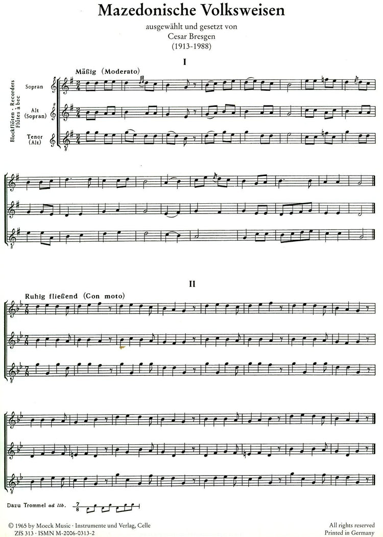 Cesar Bresgen wrote in 1965: The melodies of the printed songs found here have been taken over unchanged from a collection of the Macedonian Folklore Institute published at Skopje in 1953 and containing 208 popular tunes. In the songs presented here we have tried to take the proper character of these tunes to a certain extent into account. The original folk music of Macedonia uses wooden flutes without beaks (which resemble the 'Kaval' flutes of Bulgaria), so that it seems quite natural to transpose this music to the tonality of our recorders. Of course, the kind of executing this music requires deviates considerably from the score; ornaments and subjectively changing expression, simply the freely improvised modifications are giving these melodies the typical colour and form. Characteristic for the sound of Macedonian folk music are above all the low folk-oboe (Urla) and Tapan (large drum) as well as the Tarabuka, the proper solo instrument of the tambourine type among the drums, which is spread in the whole Arabian area up to Lower Egypt.
