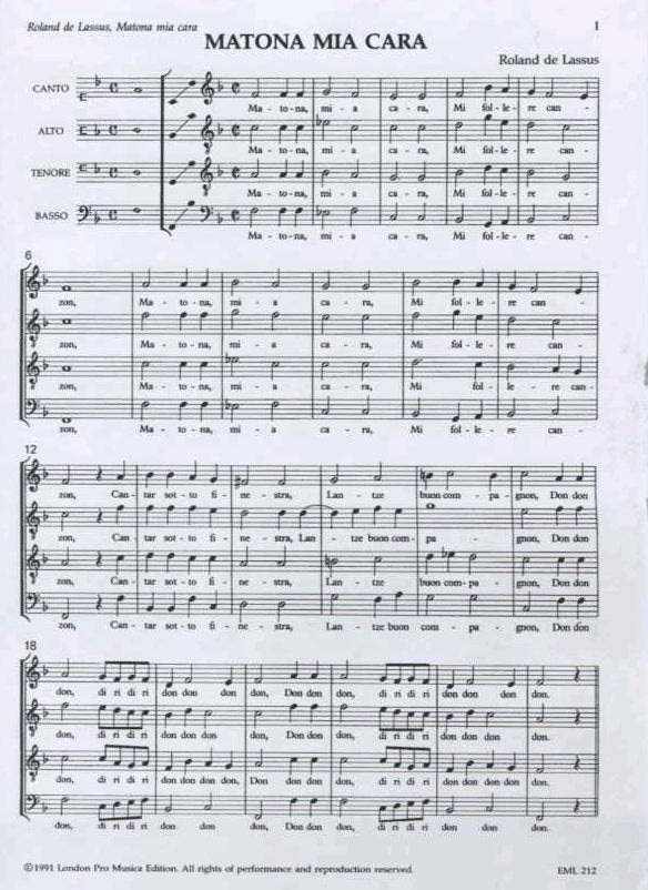 *Renaissance Composition.* This is a very broadly comic piece, in which a _lanzo_ (German or Swiss mercenary soldier) crudely serenades his intended victim in broken Italian. A typical Floretine carnival song of around 1500.