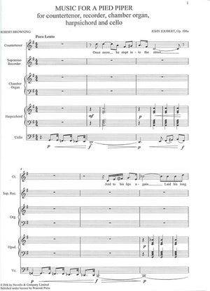 The original version of Music for a Pied Piper was commissioned in memory of David Munrow by the King's Singers and the London Early Music Group to commemorate the tenth anniversary of David Munrow's death and first performed by them on 21st January 1986 at the Queen Elizabeth Hall, London.