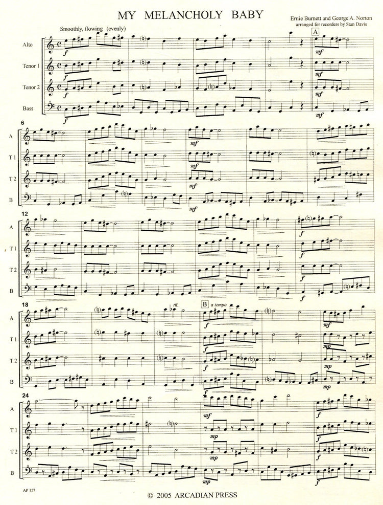 *Jazz Song arrangement* for recorder quartet and optional vocal. Includes song lyrics.