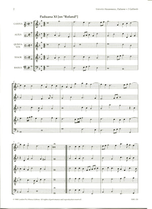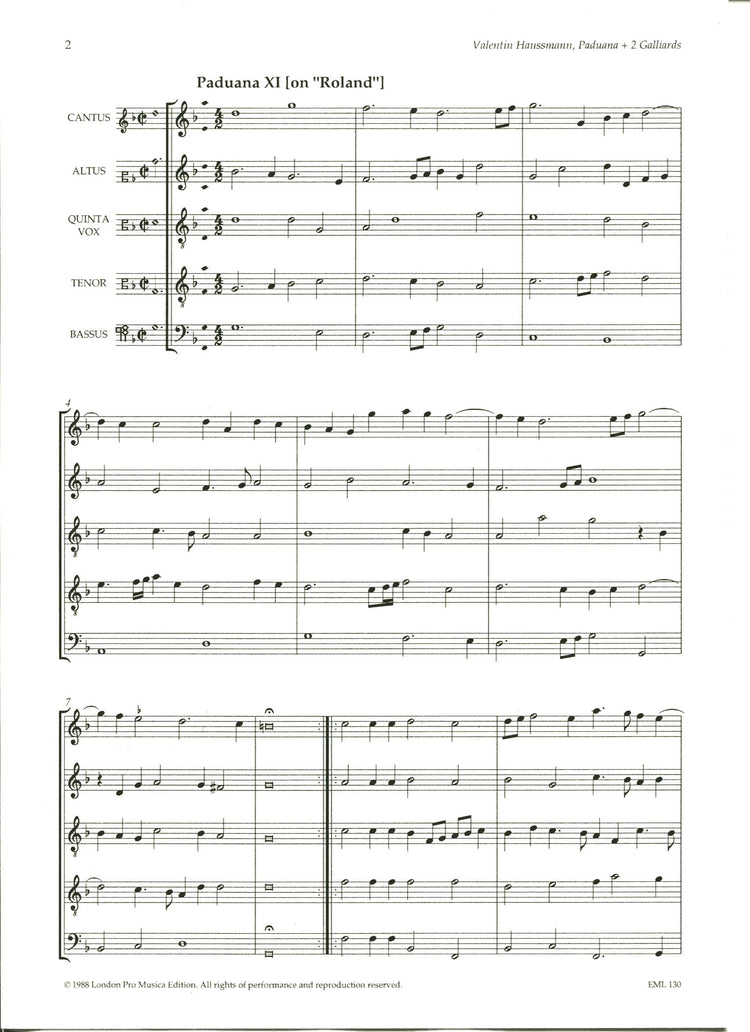 The Paduana printed here is based on the English ballad tune ""Rowland", sometimes known as "Lord Willoughby~~~~~s, which was popular in Germany (other settings found in our TM51, and a magnificent long canzon by Samuel Scheidt in MP7).