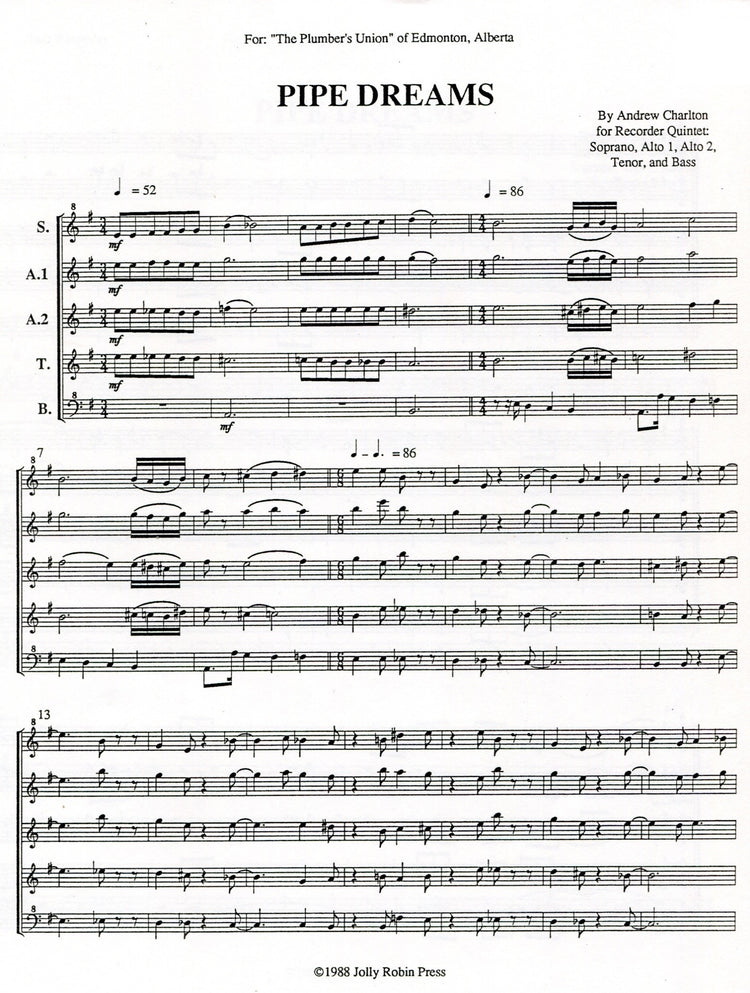*Jazz-inspired Piece* written for SAATB recorder quintet.