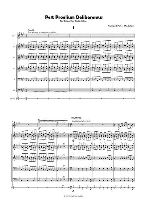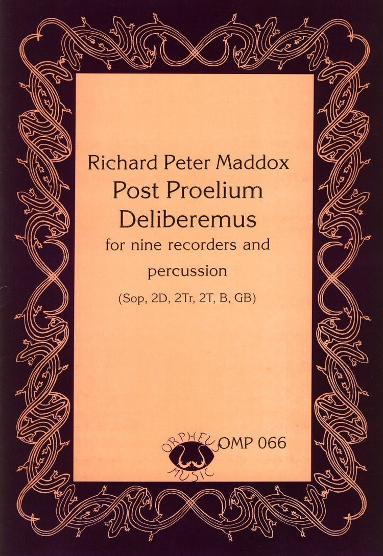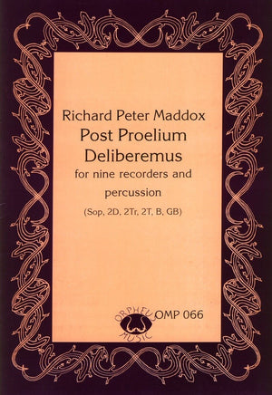 ...Richard Peter Maddox's, Post Proelium Deliberemus (deliberations after the battle)... mixes modern day aleatoric procedures and minimalism with aspects of Baroque form and style, using a conservative tonal language. Though he employs a wide range of recorders, most of the activity occurs in the upper parts, with the sopranino taking a concertant role.